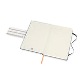 Todos os cadernos desta nova colecção são pautados, com os cantos arredondados e fecham com elástico. O papel é em cor marfim 70g/m2.