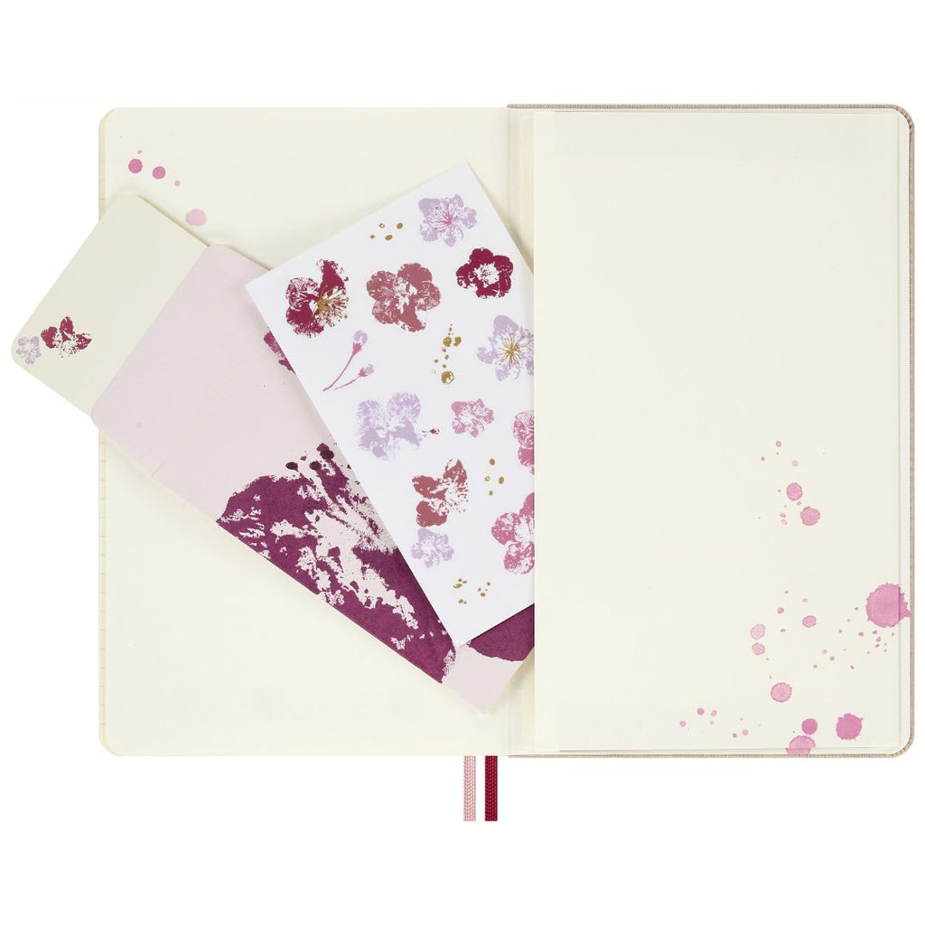 A capa deste novo caderno de Edição Limitada tem capa dura e cantos arredondados e apresenta uma impressão de flores de cerejeira com gravação dourada, inspirada na técnica tradicional japonesa Gyotaku, que imprime elementos naturais reais com tinta sobre papel.