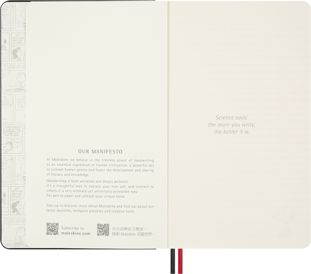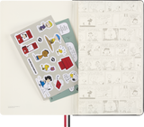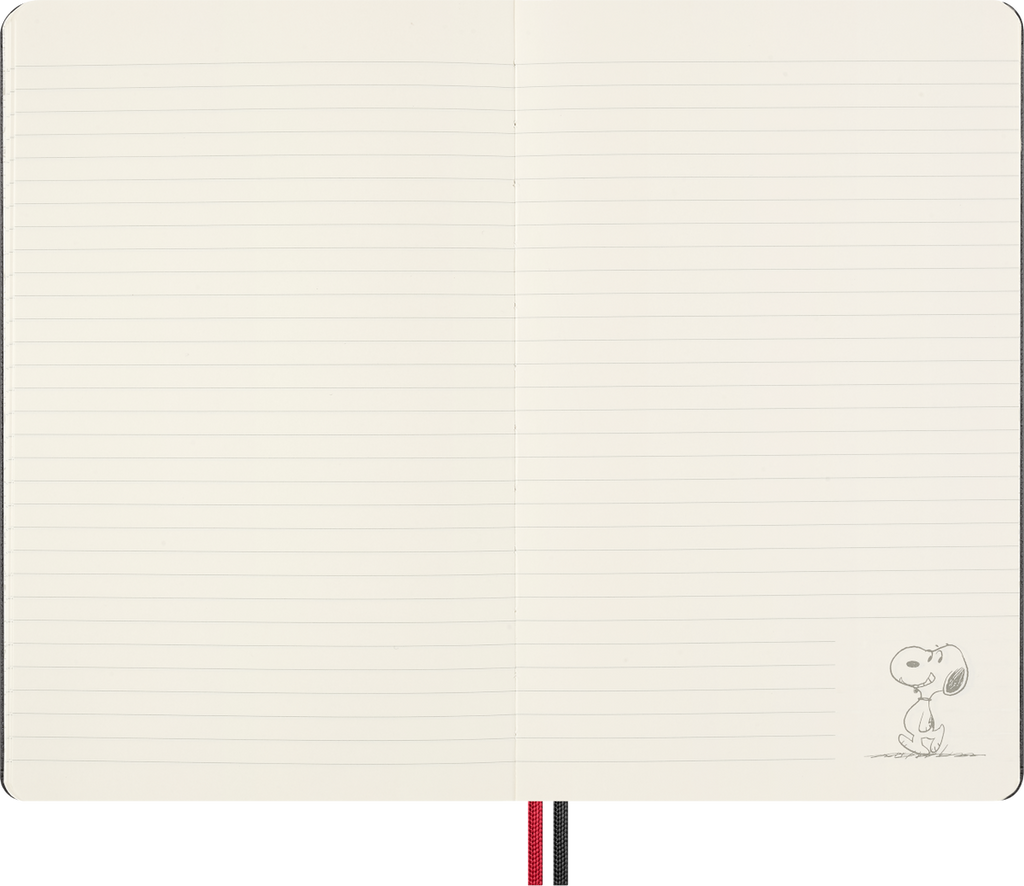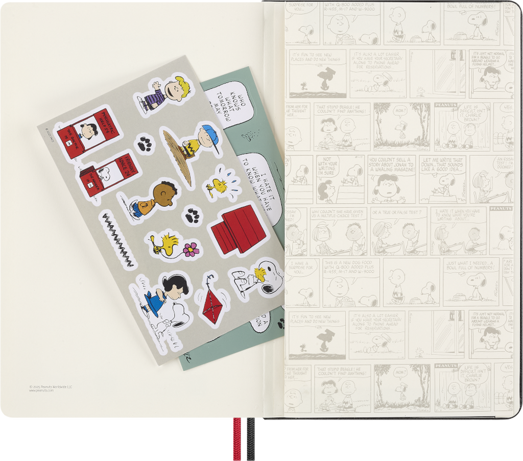Pensado para unir criatividade e funcionalidade, inclui um emblema bordado autocolante, autocolantes temáticos de Peanuts, um marcador de páginas em papel e folhas de guarda com design exclusivo. A capa dura, o fecho elástico e as duas fitas marcadoras mantêm as tuas notas seguras e bem organizadas.
