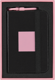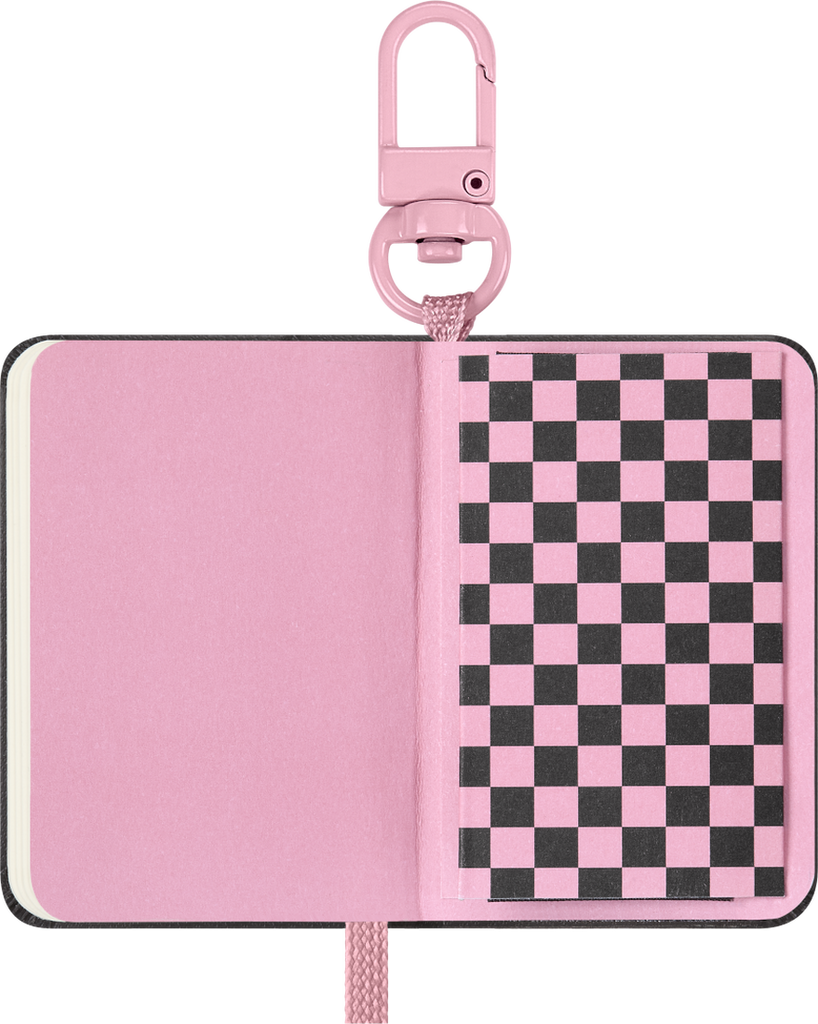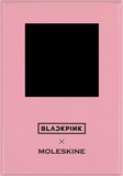 O mini caderno-amuleto de tamanho reduzido - 4,5 x 6,8cm - tem capa dura inspirada nas BLACKPINK, cantos arredondados, fecho elástico e fita marcadora rosa. As 192 páginas são lisas, destacáveis e feitas de papel de 70 g/m². Tem uma bolsa extensível na parte de trás e um gancho metálico rosa.