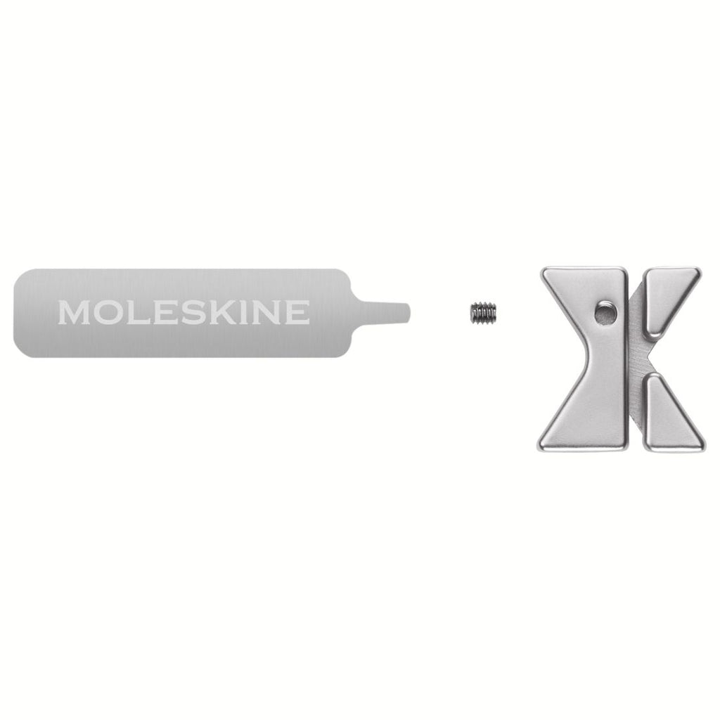 Os Pins são feito em liga de zinco e trazem uma chave de fendas e parafuso especiais para a sua fixação no fecho elástico dos cadernos