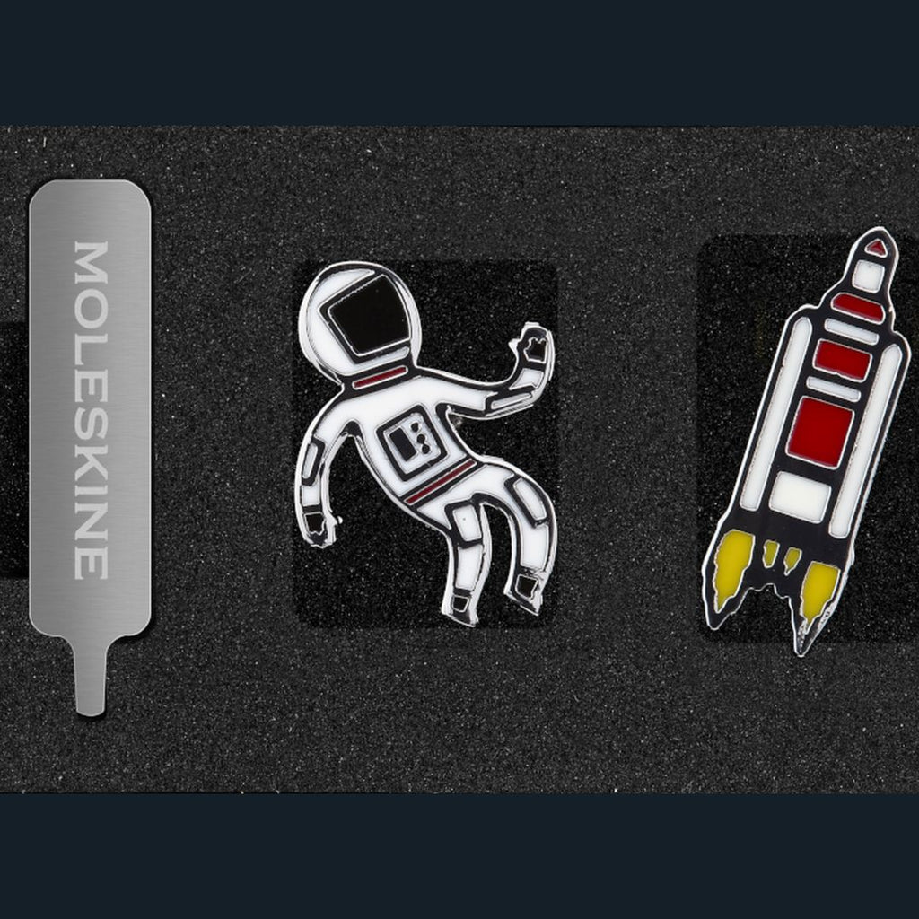 Os pins da Edição Limitada inspirada na NASA são o acessório perfeito para o fecho elástico dos cadernos ou agendas, tornando-os pessoais e num presente verdadeiramente especial para visionários de todos os tipos — pensadores, inventores, sonhadores e exploradores — do passado, do presente e do futuro.